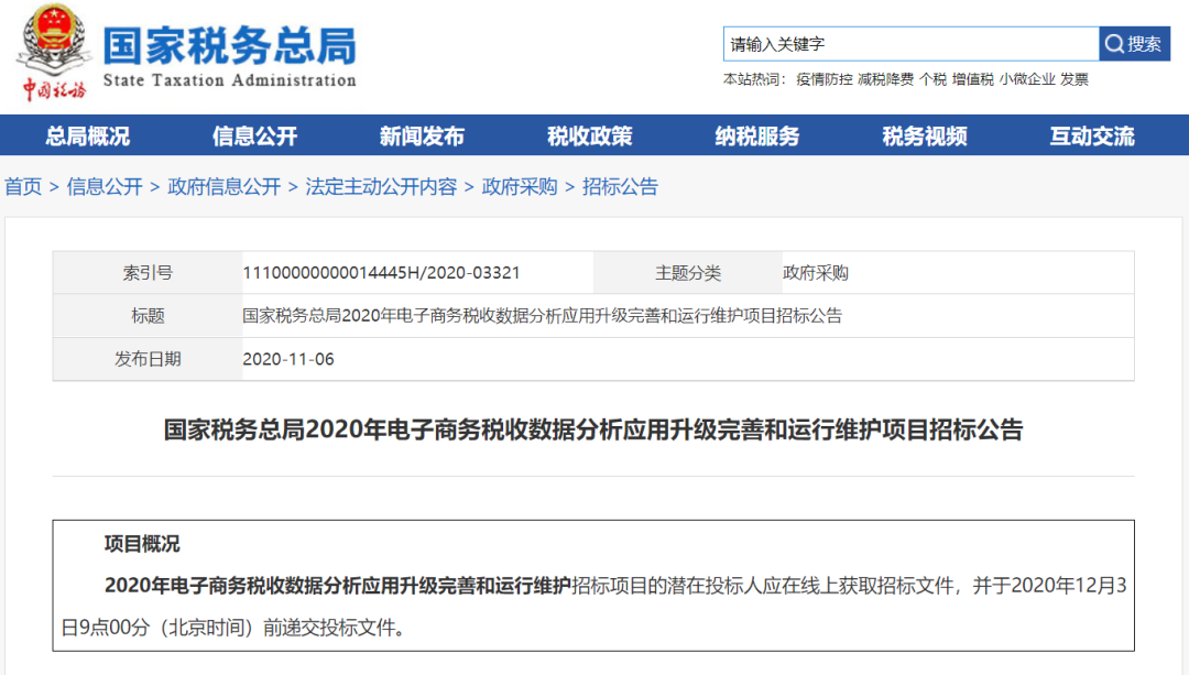 盡管電商自查風波已經過去,但是廣大電商企業仍舊不能放松對于稅務問題的關注,無論從電商自查的監管手段,還是近期三部門聯合召開的行政指導會精神來看,未來國家對于電商產業的稅務機關是日趨嚴格的,未來對于電商平臺以及商戶的稅收監管手段會不斷完善,促使電商產業的稅務管理趨向規范化。我們關注到,近期國家稅務總局發布了主題為“2020年電子商務稅收數據分析應用升級完善和運行維護項目”招標公告,其招標需求為:“在發揮好原有系統數據獲取和分析的基礎上,根據新的法律法規要求和電子商務發展的趨勢,摸清電子商務平臺基本情況,并根據稅收征管特點進行合理分類,同時擴大原有電子商務稅收數據采集、分析、應用范圍,持續做好項目運維服務,為電子商務稅收數據供給和分析應用穩定運行提供保障。”