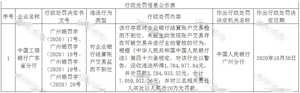 中國工商銀行廣東省分行存在“對企業銀行結算賬戶交易監測不到位,未按規定發現賬戶交易存在可疑交易并進行主動管控”等問題。