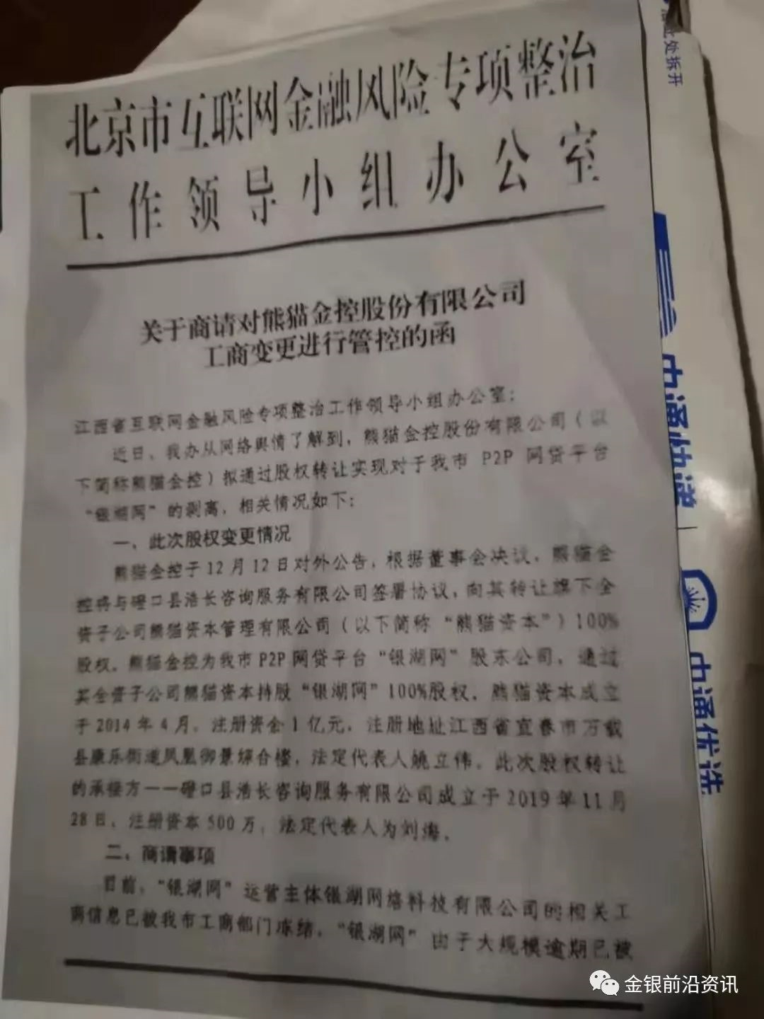 (3)發函情況,內蒙古方面還表示,收到了江西的轉發過來的函,該函為市金r局“北京互聯網金融風險專項整治小組行文發給江西jrj的《關于商請對熊貓金控有限公司工商變更進行管控的函》”,為12月16日北京發給江西的。我們的借友觀看了該函,如下圖,也希望大家認認真真讀幾遍。